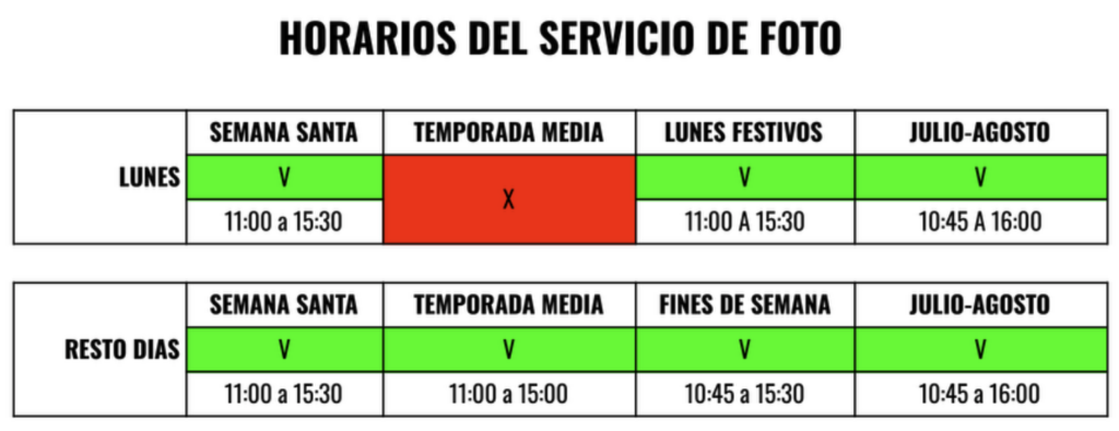 - Calendario y horario del servicio de foto según temporada (ver cuadro)
